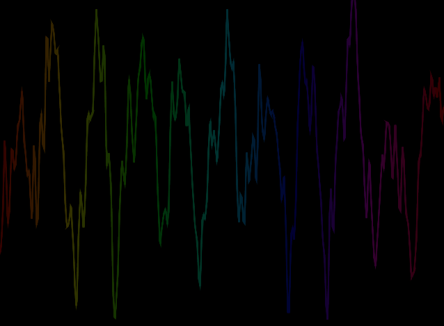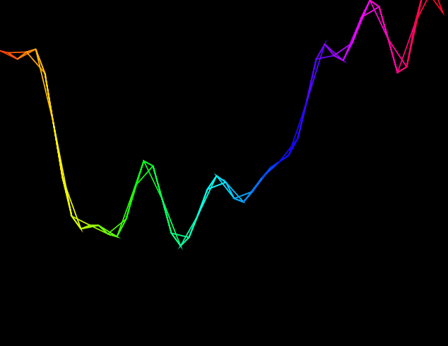 Firstly, I changed the colour of the wave to fit the HSB colour mode. This was done using the colorMode() method, setting the mode to HSB and the maximum range for all colour elements to be however many samples the program is taking per second. This achieves an effect like: