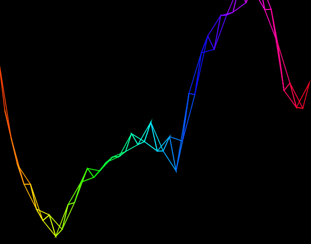 This effect is also showing the “TRIANGLE_STRIP” beginShape() mode. Since the wave is constructed with connected vertexes, this turns the vertexes into connected triangles. Experimenting with other beginShape() modes gives interesting effects too, such as “TRIANGLE”: