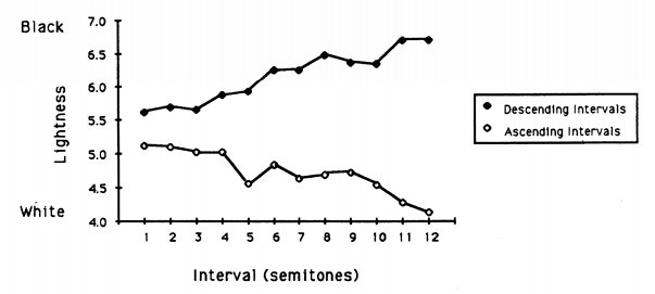 Lighter stimuli were chosen for ascending melodic intervals, and like with pitch, darker stimuli were chosen for descending melodic intervals.