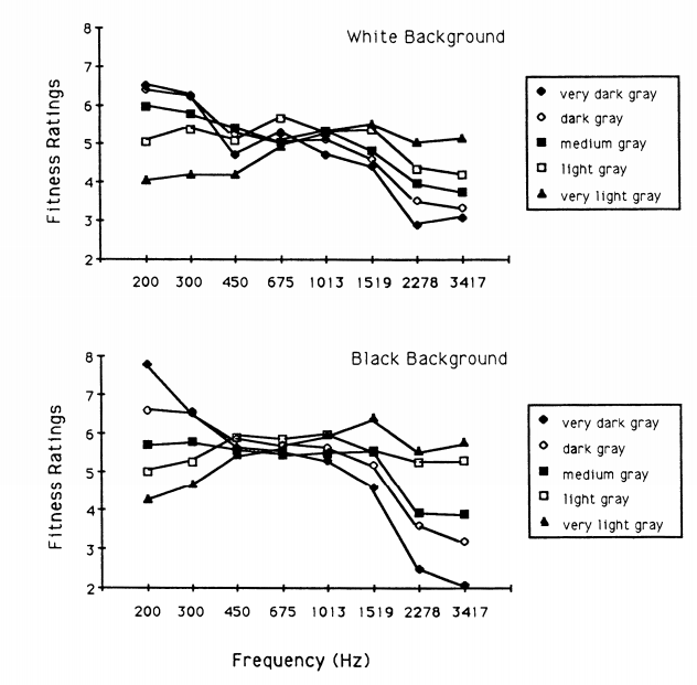 The patterns of stimuli seemed to be stronger against a black background as opposed to a white background (something to consider for the project). However, the strength here dissipates when there is a large set of lightness levels “from which to choose the visual lightness level”.